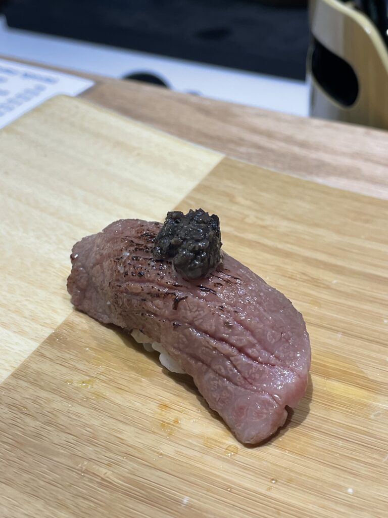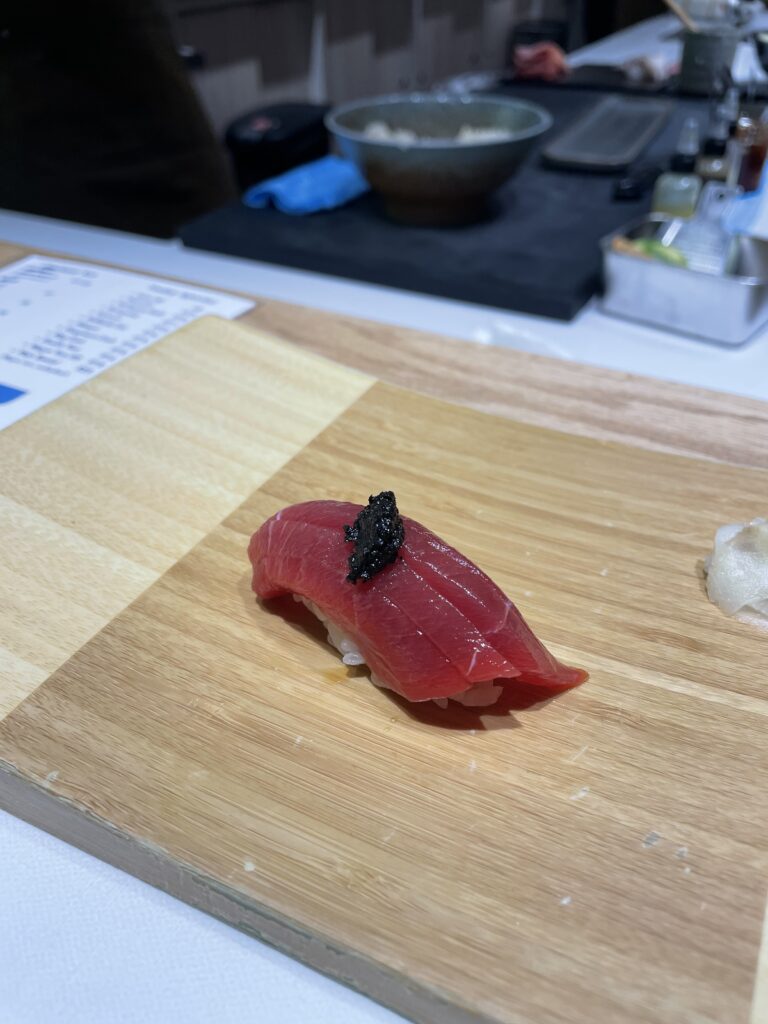 The experience then elevates with chu-toro and o-toro—medium and fatty tuna that arrive buttery and melt-in-your-mouth, dramatically topped with gold dust. The lineup continues with kinmedai or gindara (goldeneye snapper or black cod) offering smooth, savory notes, and orata (bream) providing a lighter counterpoint before the courses shift into more luxurious territory.