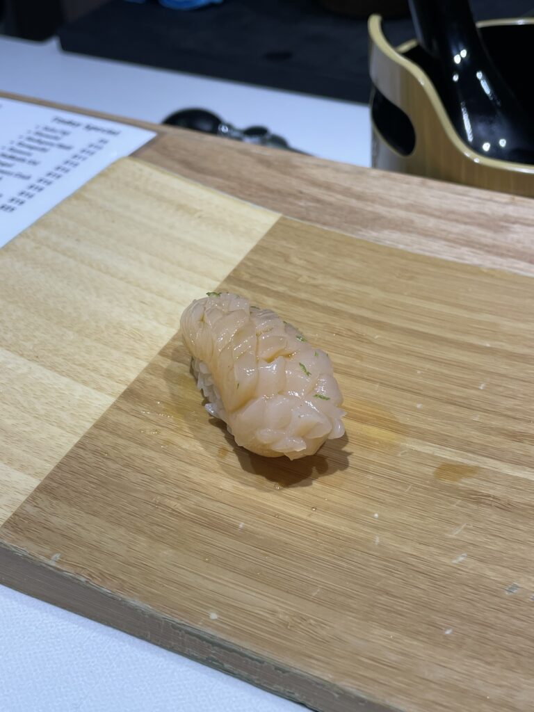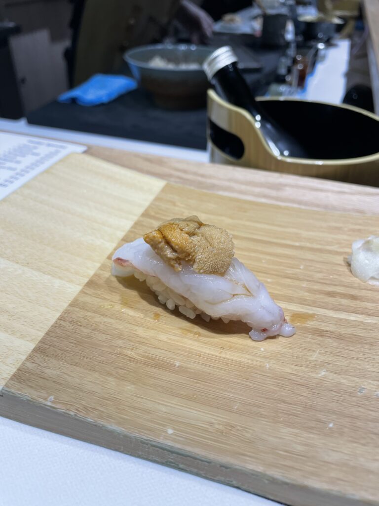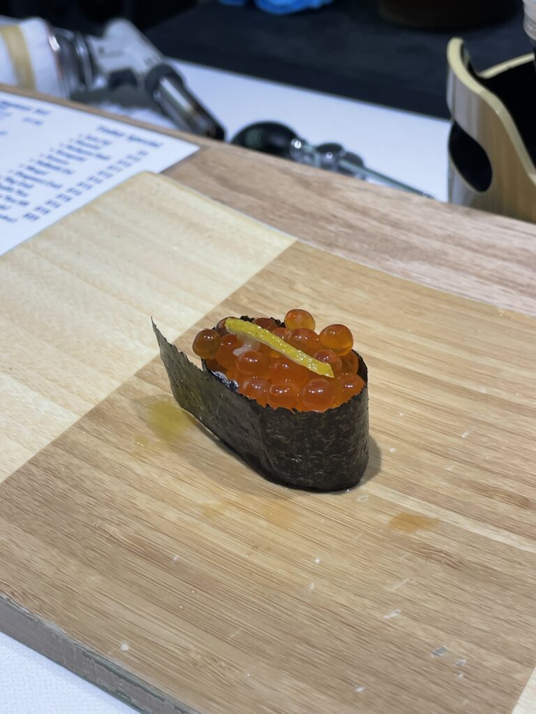 The second half of the meal brings some of the most memorable bites. Cold, umami-rich ikura (salmon roe) served on rice is followed by one of the standout courses: ebi-uni, featuring sweet shrimp generously topped with fresh, creamy sea urchin.