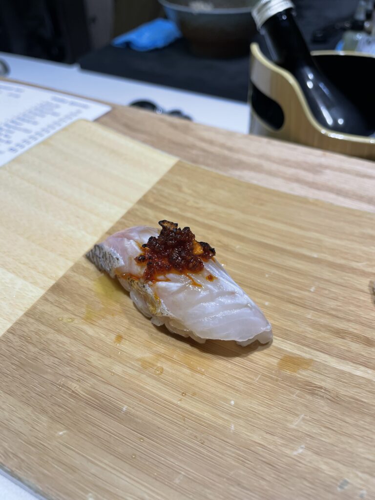 The 13-course progression at this omakase begins with lighter, delicate fish before building to richer, more indulgent offerings. The meal opens with madai (sea bream) and suzuki (sea bass), both clean and subtly seasoned, followed by akami (lean tuna) that delivers satisfying depth.
