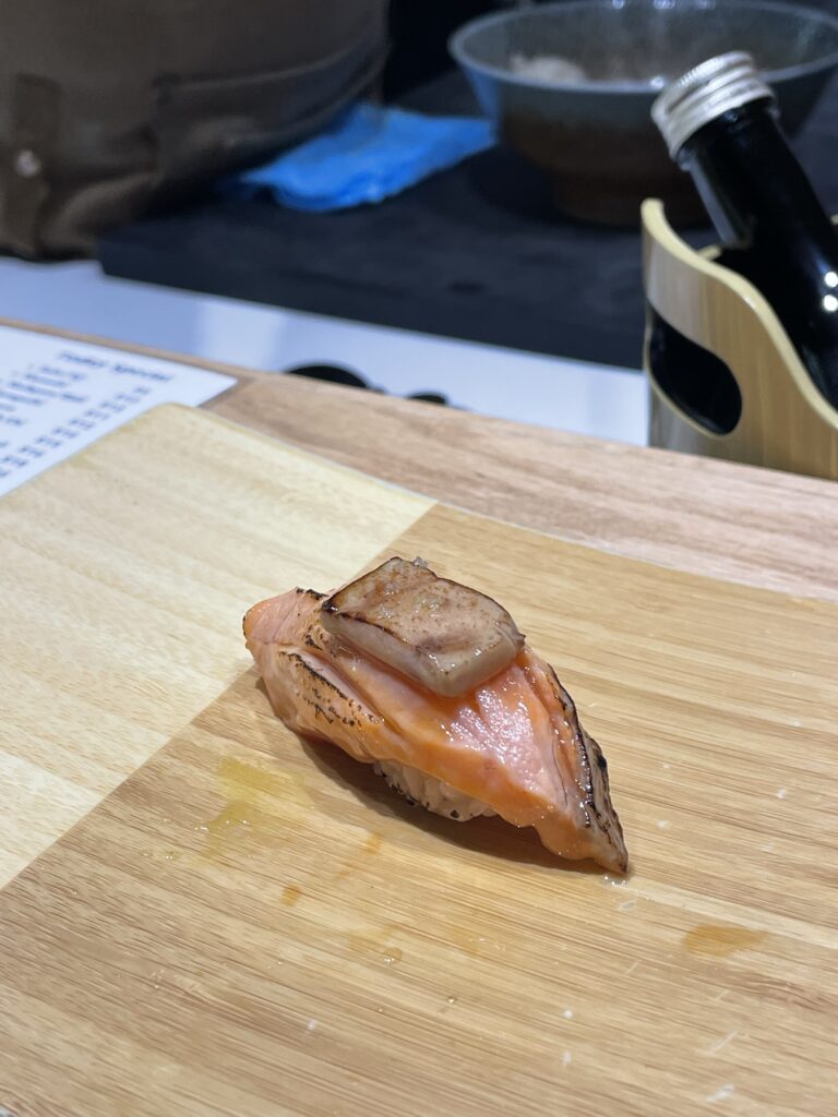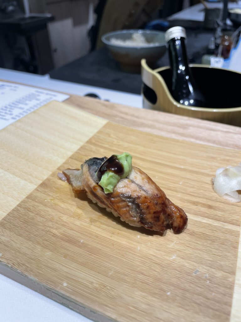 Then comes a luxurious pairing of salmon with foie gras, followed by Hokkaido scallop (hotate) and grilled A5 wagyu topped with truffle—juicy and indulgent. The procession concludes with unagi (eel) glazed in sweet sauce with crispy skin and homemade avocado sauce, and finishes with a hand roll (salmon-toro on the day of this visit).